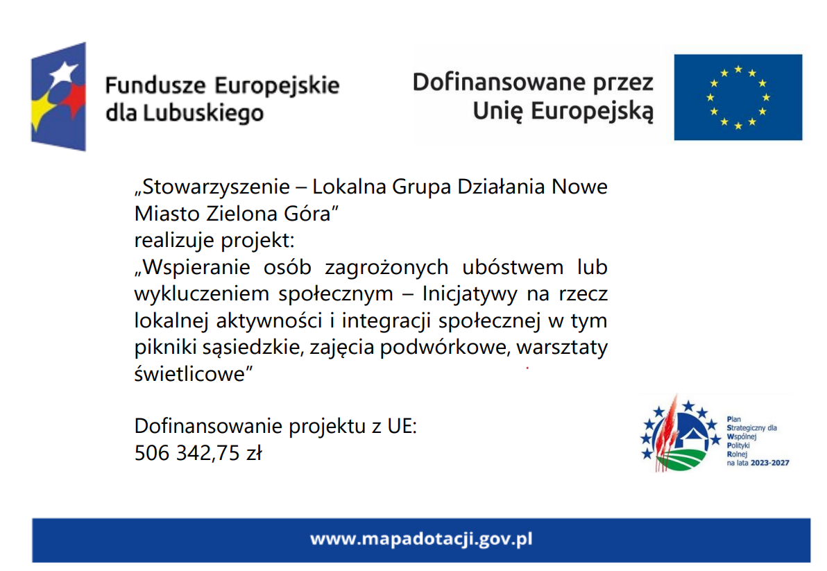 Celem projektu jest aktywizacja społeczna osób wykluczonych lub zagrożonych wykluczeniem społecznym (a także ich rodzin/ głównie dzieci) oraz rozwój społeczności lokalnej Dzielony Nowe Miasto. Podejmowane działania mają przyczynić się do potrzymania lub utworzenia więzi społecznych, rodzinnych, sąsiedzkich poprzez czynny i aktywny udział w życiu lokalnej społeczności. Cel zostanie zrealizowany poprzez działania aktywizujące i integrujące lokalną społeczność, nakierowane na wzmacnianie kompetencji społecznych, po przez warsztaty, zaradności, samodzielności i aktywności społecznej z udziałem środowiska lokalnego, tj. zajęcia prowadzone przez instytucje kultury i organizacje pozarządowe (biblioteki, filie Zielonogórskiego Ośrodka Kultury, świetlice sołeckie), wydarzenia o otwartym charakterze aktywizujące społeczność do wspólnego spędzania czasu (pikniki sąsiedzkie, zajęcia podwórkowe, warsztaty, spotkania, pokazy, zajęcia o charakterze sportowym i rekreacyjnym), zajęcia integrujące i aktywizujące dla seniorów, pozwalające im na rozwój pasji i zainteresowań, warsztaty dla dzieci i młodzieży oraz rodzin. Aktywizacja i integracja społeczna pozwoli na zbudowanie potencjału lokalnej społeczności Dzielnicy Nowe Miasto w Zielonej Górze.